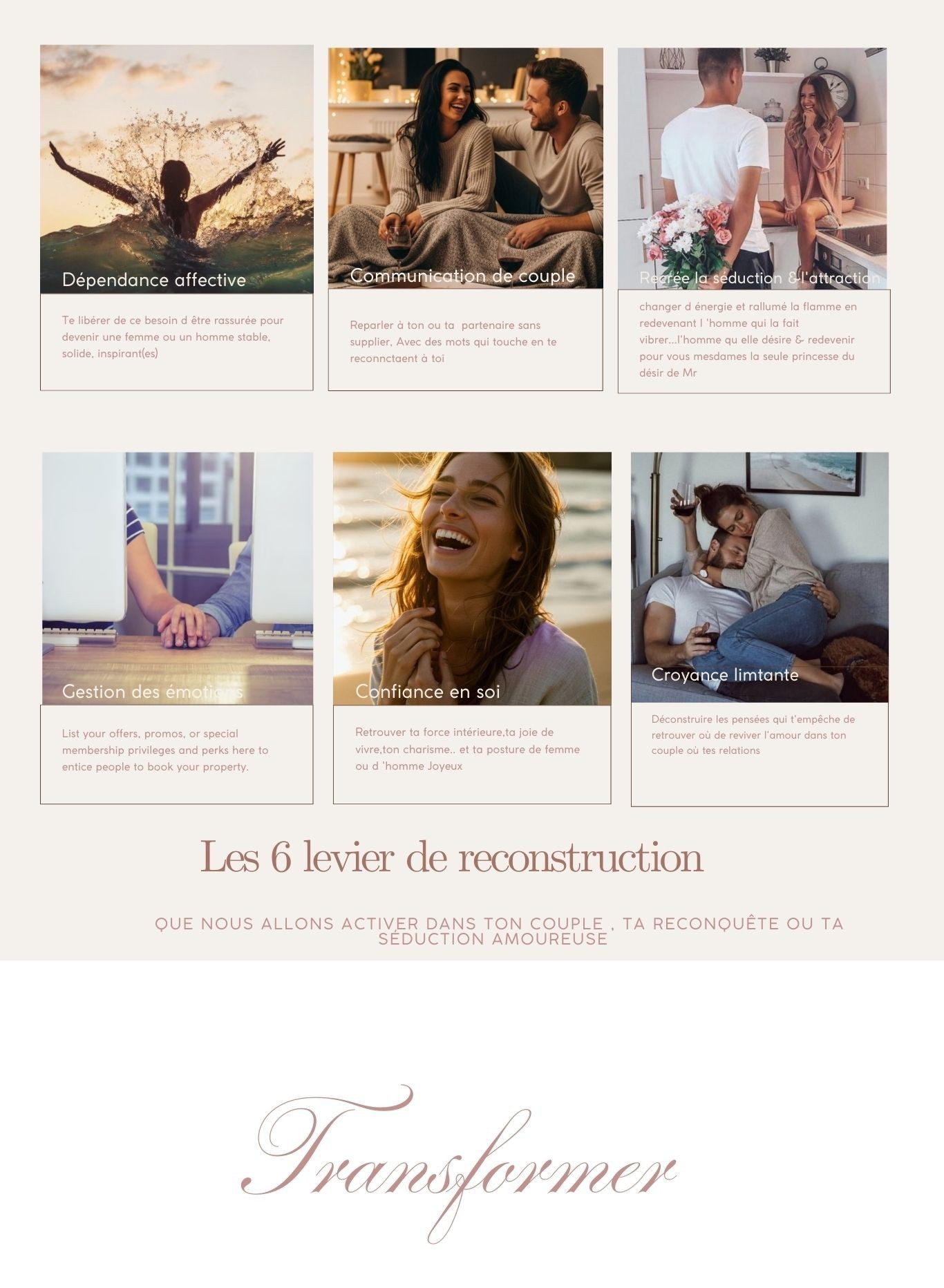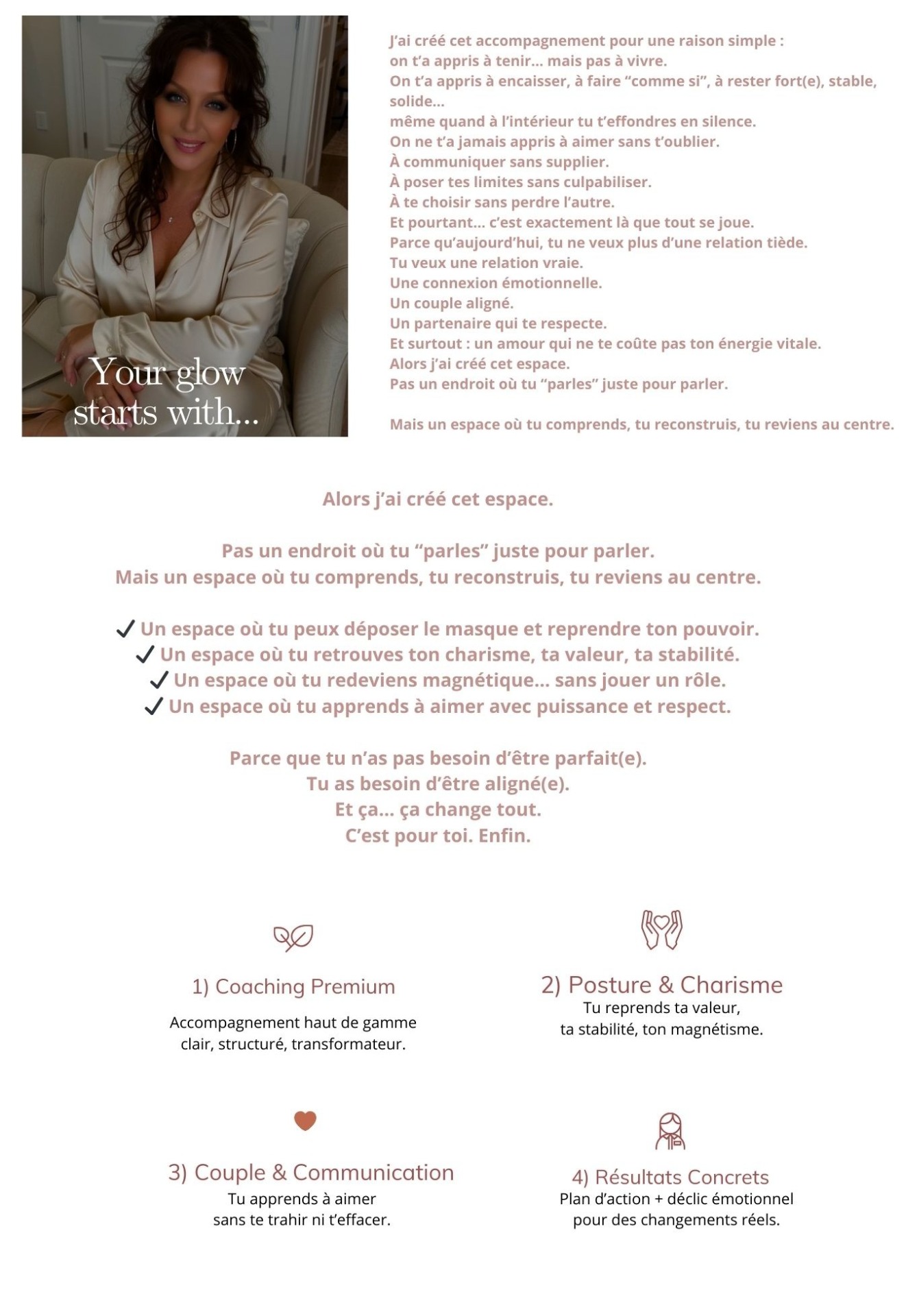 Ici, on ne cherche pas à convaincre l’autre. On se recentre, on se structure, on se respecte. Parce qu’à partir du moment où tu te choisis vraiment, les relations cessent d’être instables et deviennent des espaces de clarté, de sécurité et de désir. C’est une posture. Pas une technique. Et elle change tout. sache qu'il existe un chemin pour raviver la séduction, le liens et retrouver la personne que tu aime …Mais surtout pour te retrouver toi en tant que femme, en tant qu' homme épanoui. Ce chemin demande du courage, beaucoup de courage, mais tu ne le feras pas seul. Il commence maintenant.